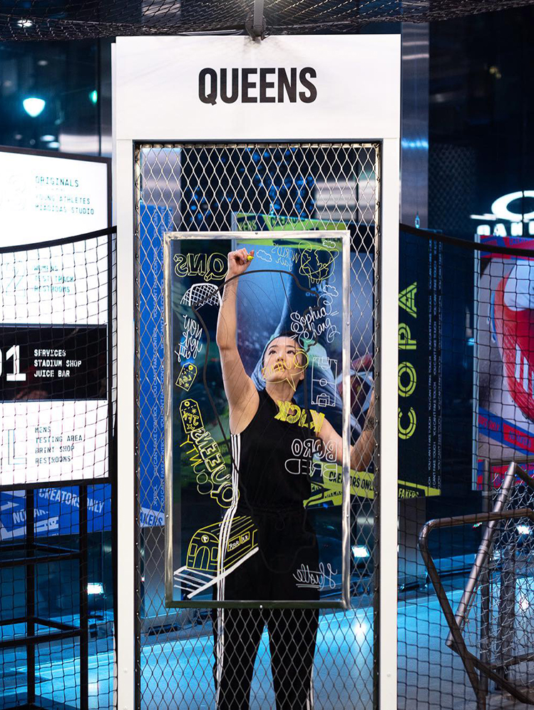 adidas activates the launch of COPA19 soccer cleat at their flagsip 5th Avenue store in New York City. Sophia creates a five-panel supergraphic installation within the shop. Celebrating NYC students of Fashion High School. Sophia illustrates the campaign window display as well as live drawing and shoe customization on-site.